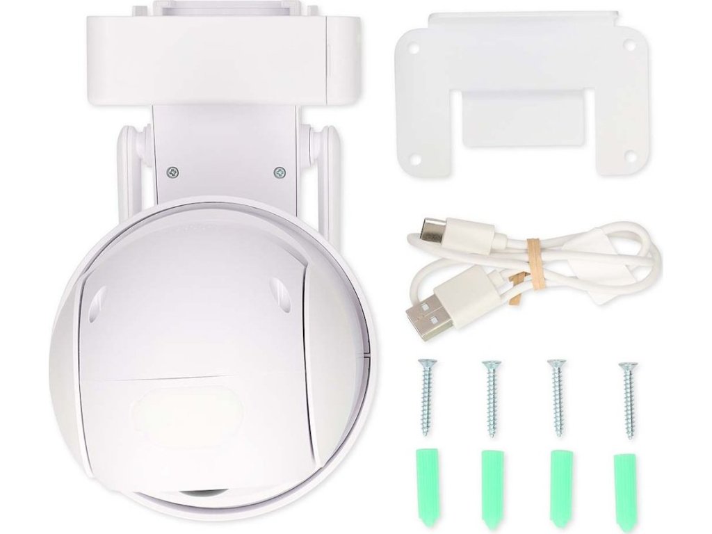 Kamera s baterií 6700 mAh, nástěnný držák, USB kabel, instalační materiály, návod k použití.