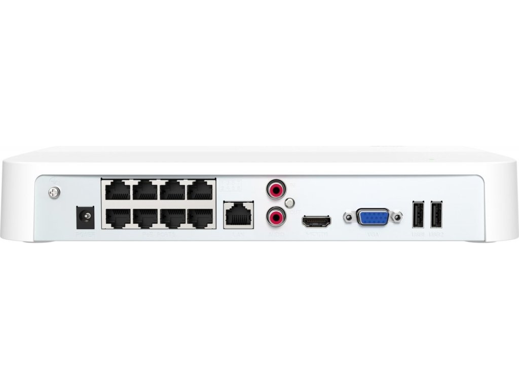 Porty: 8x LAN PoE RJ45 port 10/100 Mb/s pro připojení kamer, 1x LAN RJ45 port 10/100 Mb/s pro připojení k Internetu, 2x RCA zvuk, 1x HDMI, 1x VGA, 2x USB 2.0, 1x Napájecí Jack