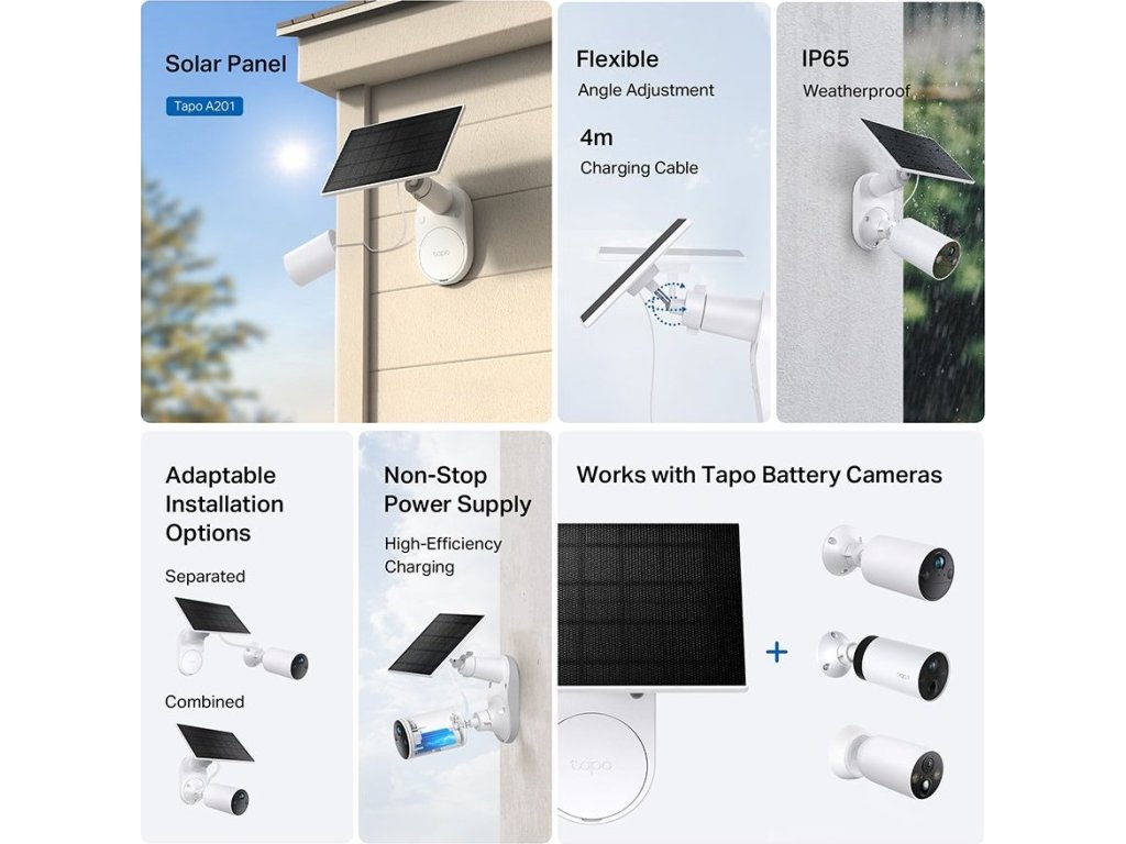 Funguje s bateriovými kamerami Tapo: Kompatibilní se všemi bateriovými kamerami Tapo, což umožňuje celoroční ochranu vaší bateriové kamery Tapo.