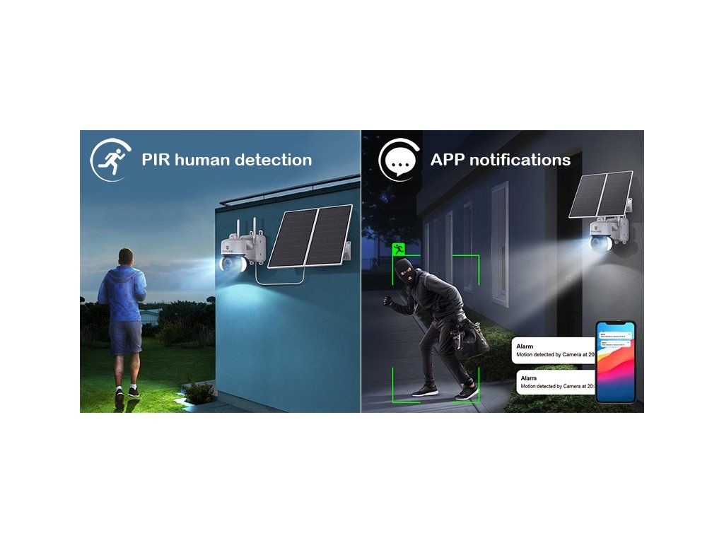 Otočný motorizovaný objektiv · ochrana IP66 · IR i barevné noční vidění až 30m · typ připojení 4G · TF/SD card uložiště · Cloud uložiště · Full HD 1080P rozlišení, výkon solárního panelu 20W max. · kapacita baterie 20000 mAh · PIR funkce · mobilní notifikace · ovládání přes mobilní aplikaci