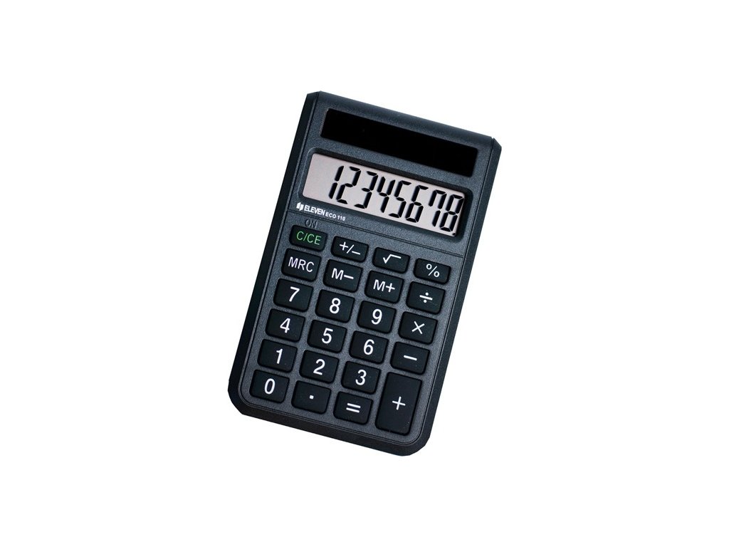 EKO kalkulačka: 8 místný displej, 3 paměťové klávesy: MRC, M+, M-, Solární napájení, Odmocnina [?], Změna [+/-], Procenta [%], No need to use batteries
