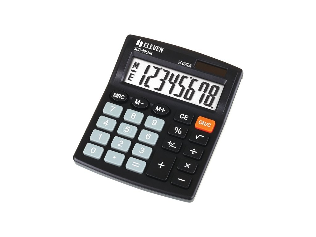 Stolní kalkulačka: 8 místný displej, 3 paměťové klávesy: MRC, M+, M-, Změna [+/-], Mazání, Procenta [%], Dvojí napájení: battery & solar
