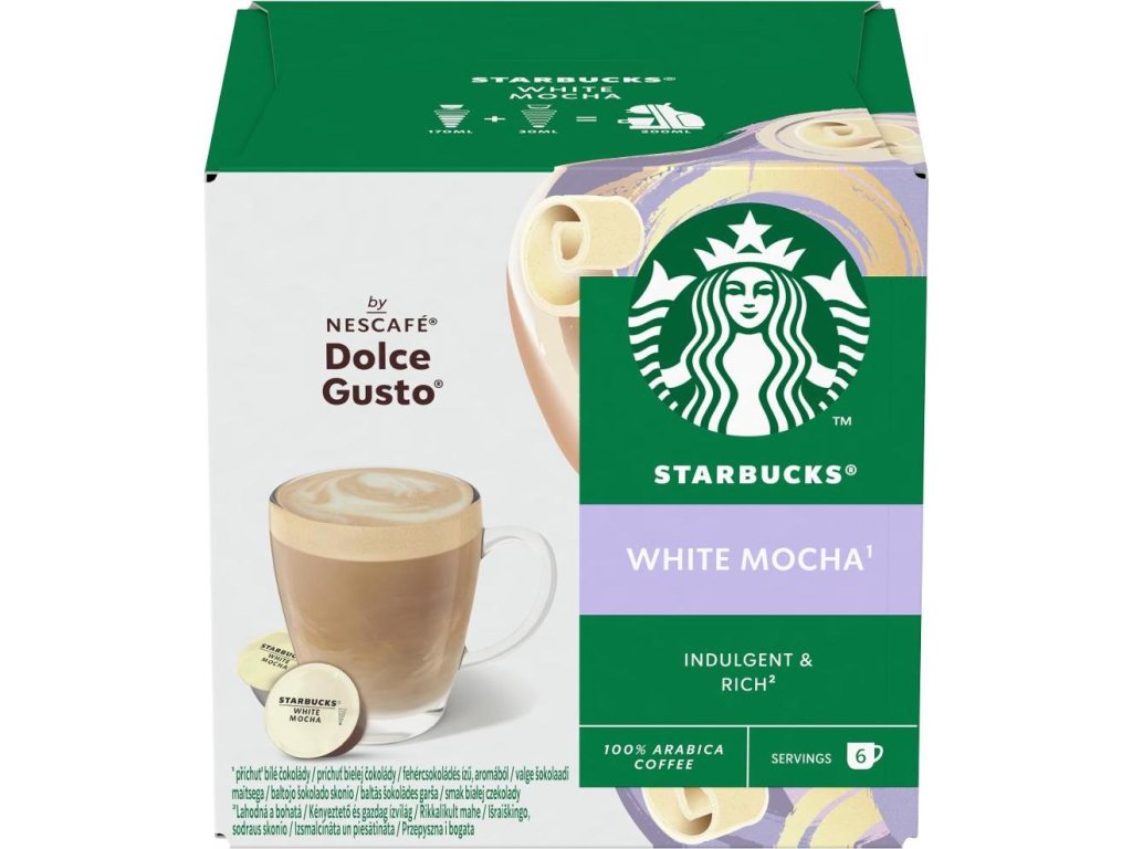 • STARBUCKS® White Mocha by NESCAFE® DOLCE GUSTO® • Vychutnejte si lahodný nápoj s bohatou chutí, který si můžete připravit doma ze stejně kvalitních zrn 100% arabiky, jaká používáme v našich kavárnách.• Kávové kapsle jsou kompatibilní s kávovary NESCAFE DOLCE GUSTO. 6 porcí v jednom balení.• Záv