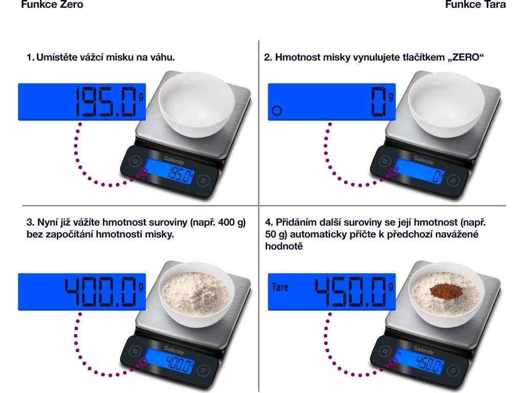 Funkce ZERO (nulování hmotnosti vážicí nádoby) & funkce TARA (postupné dovažování ingrediencí)