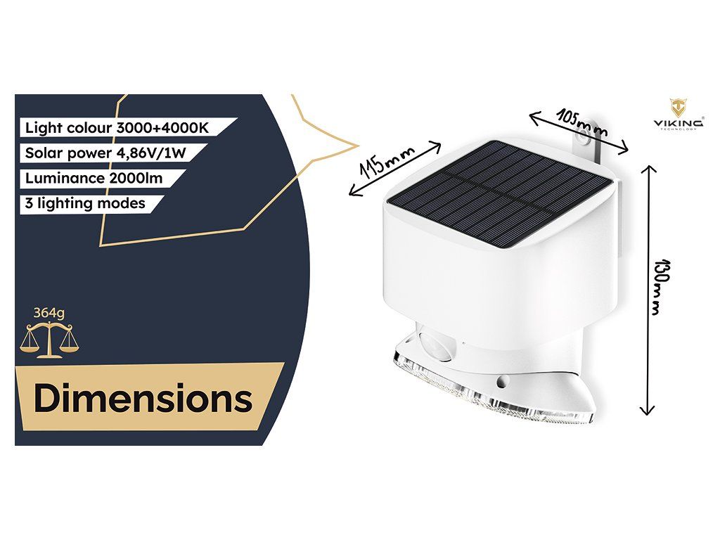 Svítivost 2000 lm • solární napájení • barva světla 3000K + 4000K (teplá a denní bílá) • 3 režimy osvětlení (včetně PIR senzoru) • doba osvětlení za nevhodných podmínek až 3 dny • odolnost IP44 • kapacita baterie 3,7V/14,8Wh • výkon solárního panelu 4,86V/1W