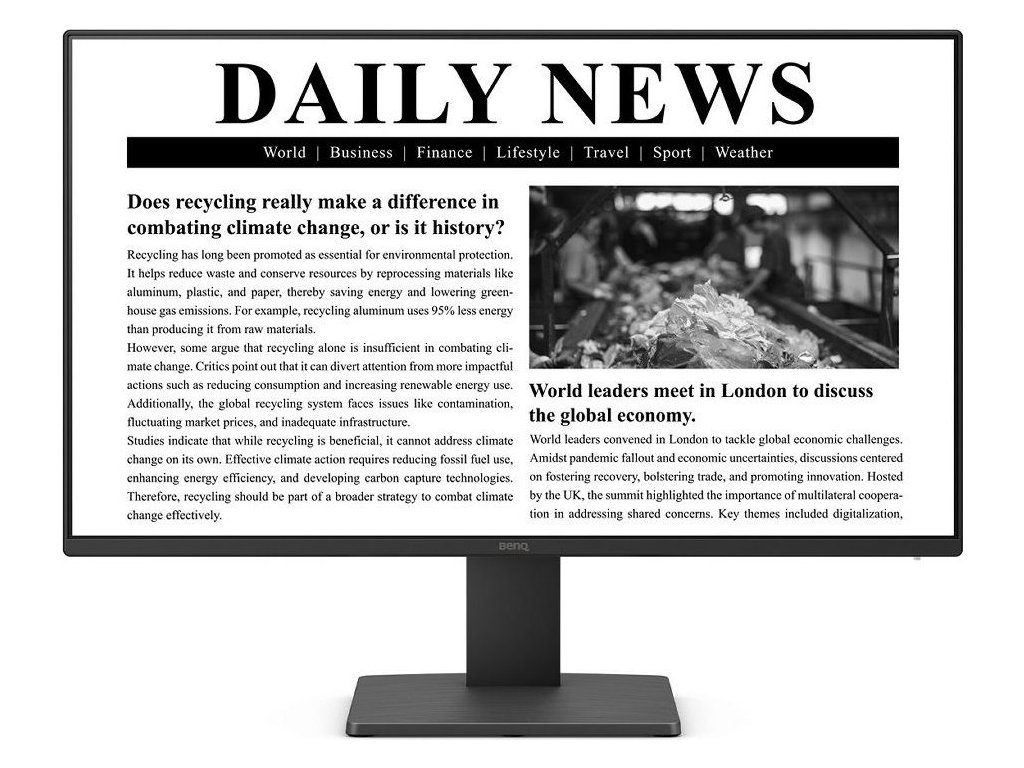 Monitor BenQ GW2491 obsahuje technologie, které zaopatří ochranu očí při dlouhodobé práci a sledování displeje. Technologie BenQ Eye-Care zaručí komfort a trvalou svěžest vašeho zraku. Zahrnuje v sobě režim ePaper, který simuluje efekt skutečného papíru a podporuje komfortní čtení. Technologie Flicker-Free potlačuje blikání displeje a samozřejmostí je také minimalizace vyzařování škodlivého modrého světla.