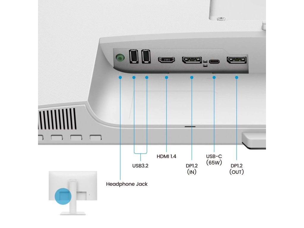Rozhraní: 1× HDMI, 1× DisplayPort vstup, 1× DisplayPort výstup (MST Daisy Chain), 2× USB 3.2 Gen1 (USB 3.0), 1× USB-C (PD 65W, DP Alt mode), 1× výstup na sluchátka
