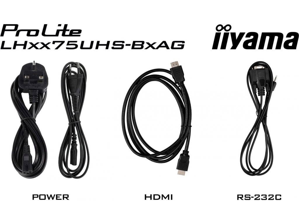 Obsah balení: napájecí kabel (1,8m), HDMI (1,8m), RS-232c (1,8m), uživatelský manuál, instrukce bezpečnosti, samolepky pro montážní otvory, drátěné přezky, dálkové ovládání (včetně baterie)
