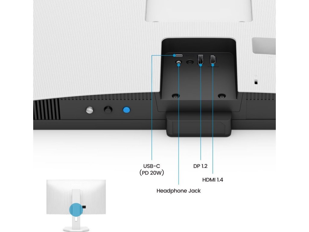 Port USB-C s DisplayPort Alt Mode zajišťuje přenos obrazu i dat a současně nabíjí připojená zařízení výkonem až 20 W. Monitor disponuje také DisplayPort 1.2 a HDMI 1.4 vstupy pro připojení více zdrojů signálu.