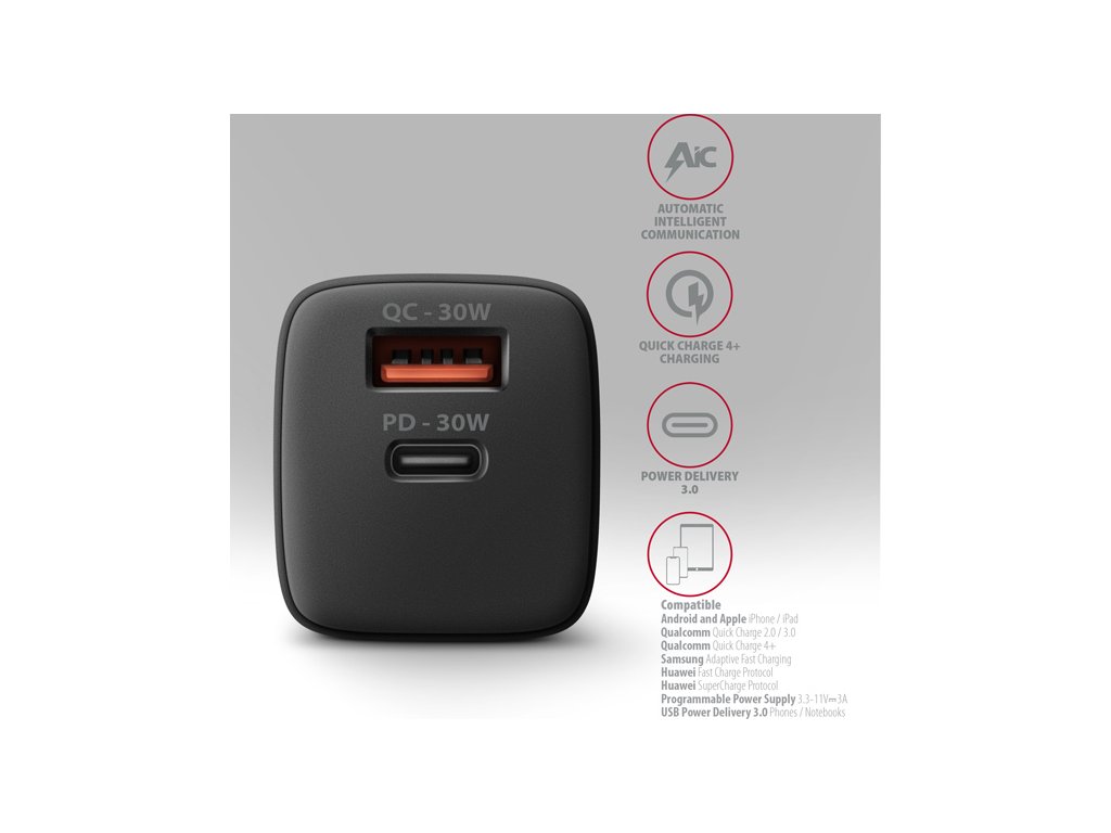 AXAGON ACU-PQ30, Sil nabíječka do sítě 30W, 2x port (USB-A + USB-C), PD3.0/PPS/QC4+/SFC/AFC/Apple, černá