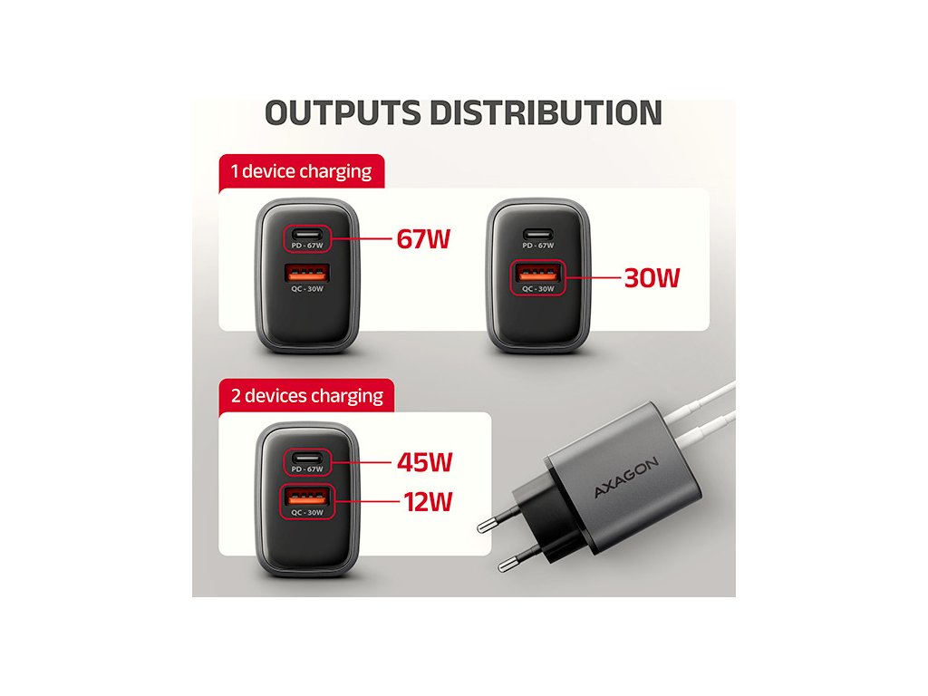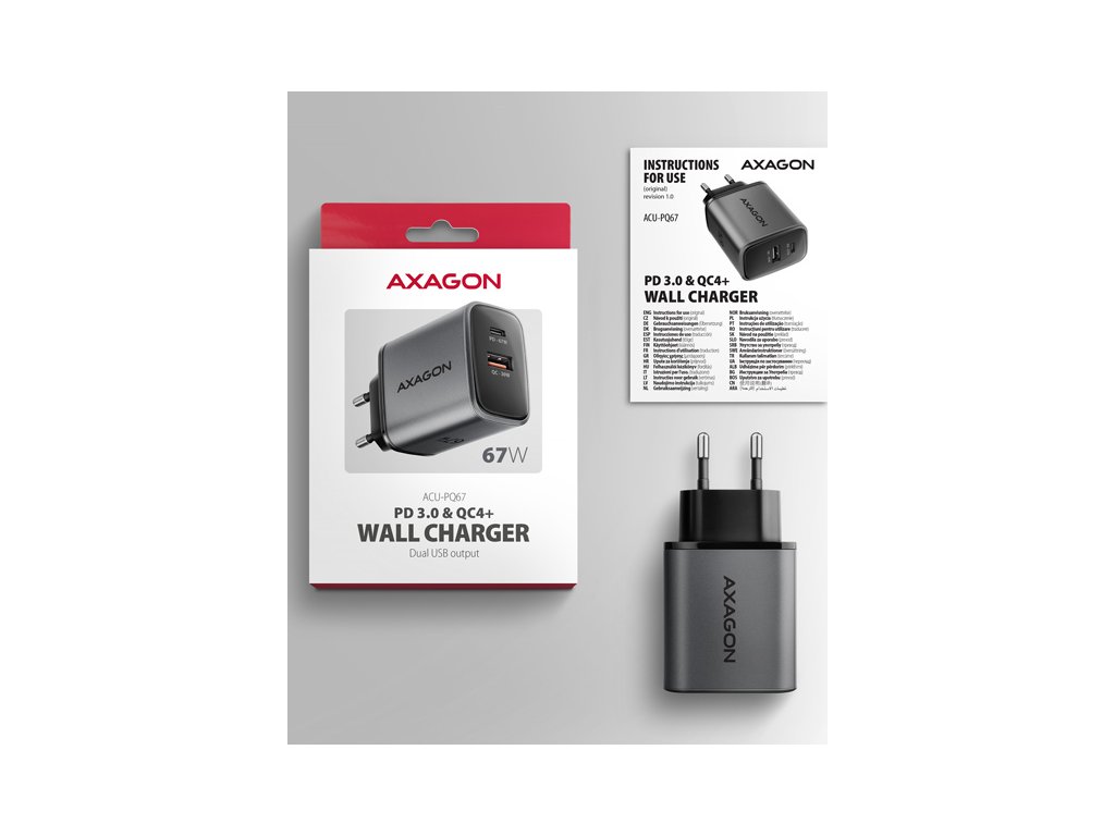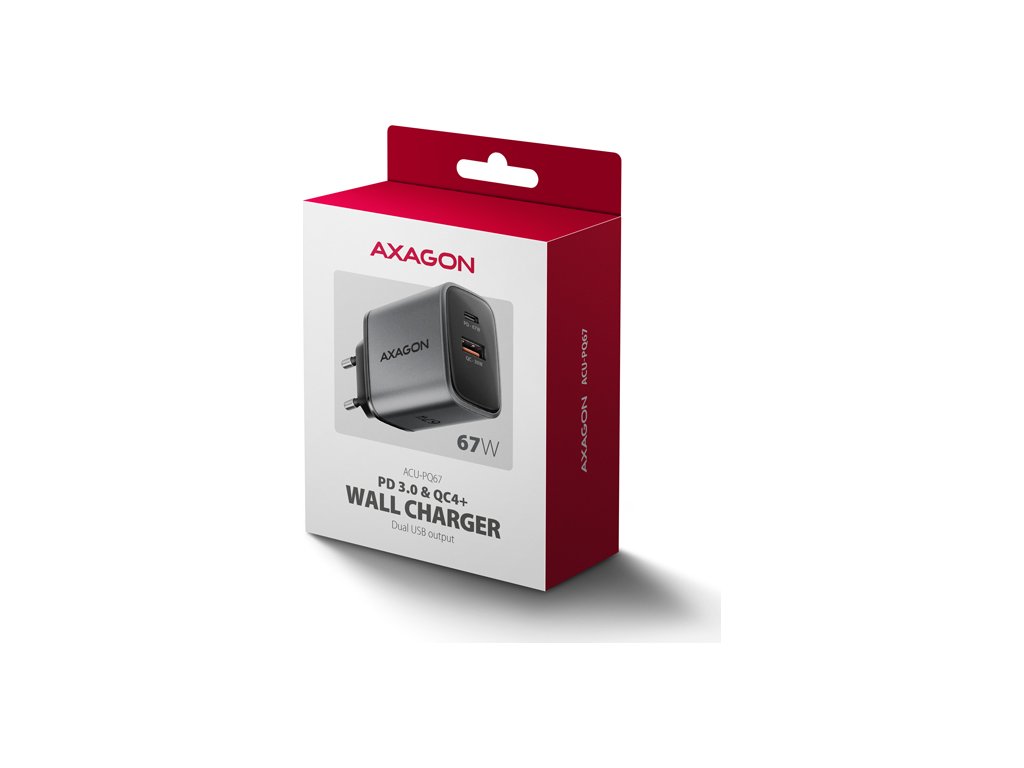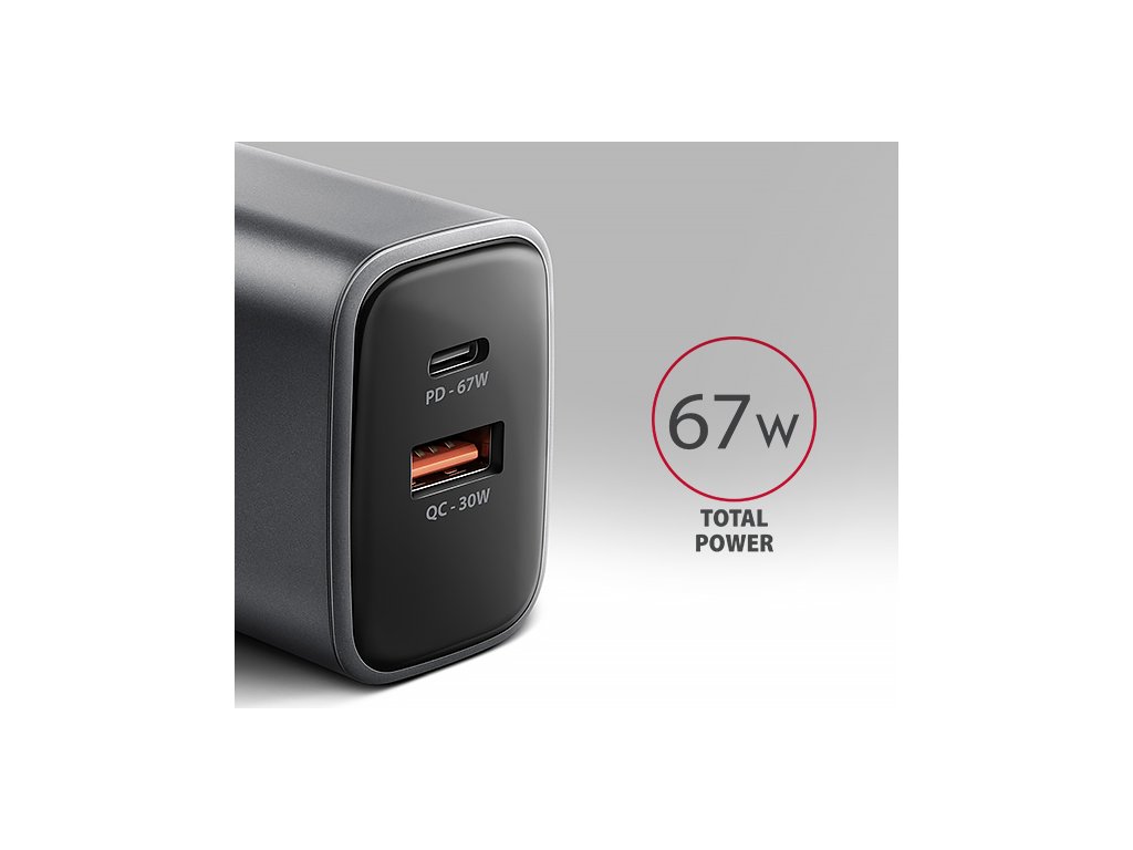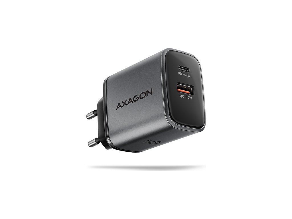 AXAGON ACU-PQ67, GaN nabíječka do sítě 67W, výstup USB-A + USB-C, PD3.0/PPS/QC4+/SFC2.0/Apple