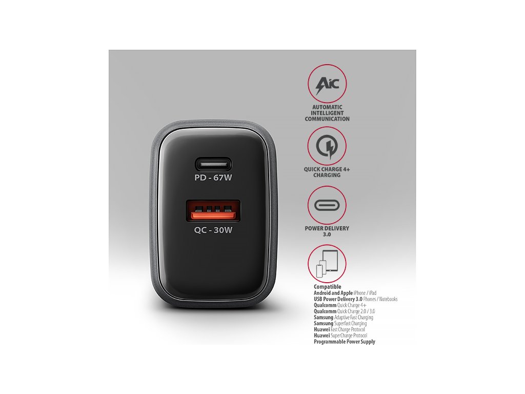 Technologie Quick Charge 4+ umožňuje až 4x rychlejší nabíjení telefonů než běžná USB nabíječka. Technologie Power Delivery 3.0 nejenže podporuje nabíjení moderních telefonů, ale také umožňuje 67W nabíjení moderních notebooků.