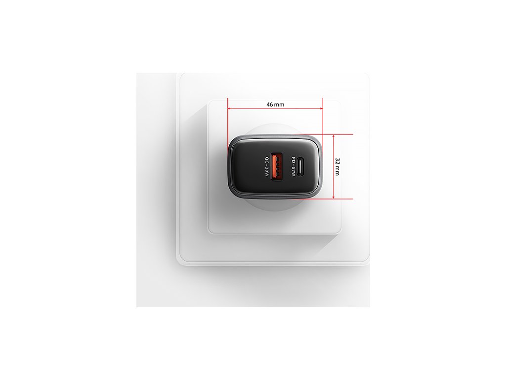 Tělo napájecího adaptéru má příjemný tvar a kompaktní velikost. Ve srovnání s klasickými nabíjecími adaptéry se stejnými parametry je velikost této nabíječky až o polovinu menší. Kombinace malých rozměrů, dosažených pomocí GaN technologie, a širokého rozsahu vstupního napětí, dělá z této nabíječky ideálního pomocníka na cesty.