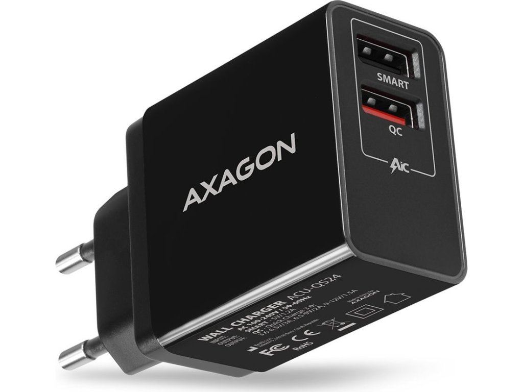 AXAGON ACU-QS24, QC & SMART nabíjačka do siete 24W, 2x port USB-A, QC3.0/AFC/FCP + 5V/1,2A