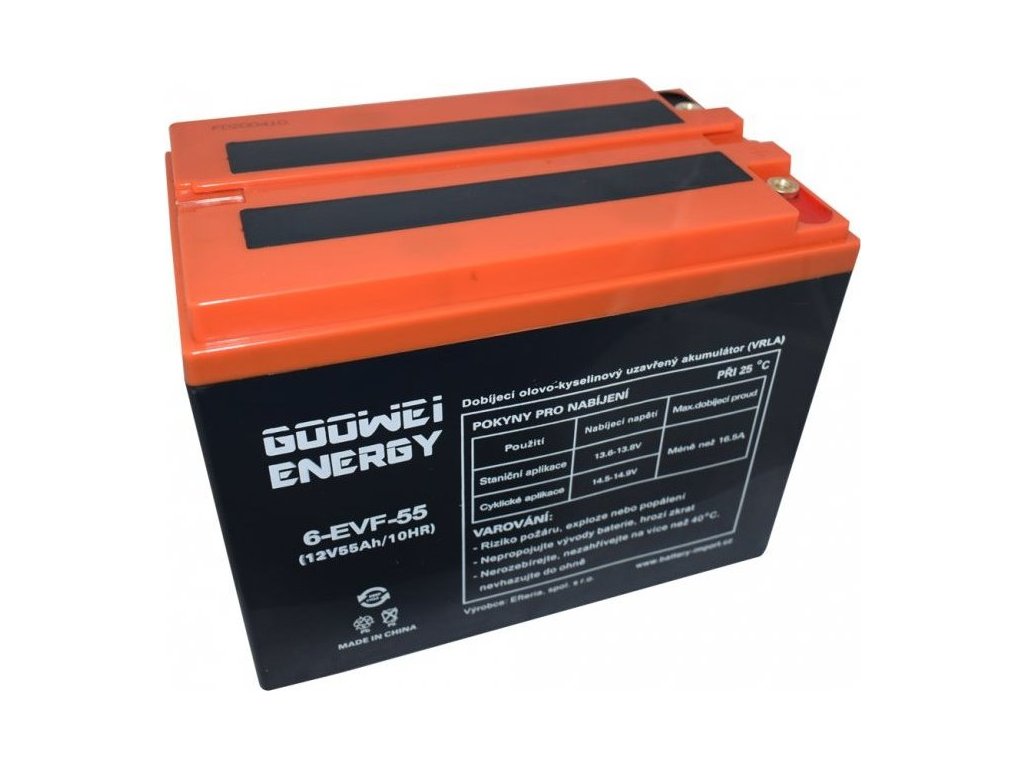 GOOWEI ENERGY 6-EVF-55Záložní 12 V, 55 Ah olověný akumulátor v provedení VRLA (GEL) vhodný pro aplikace, kde dochází k častému a hlubokému vybíjení / cyklování, tedy hlavně pro pohony elektromotorů.