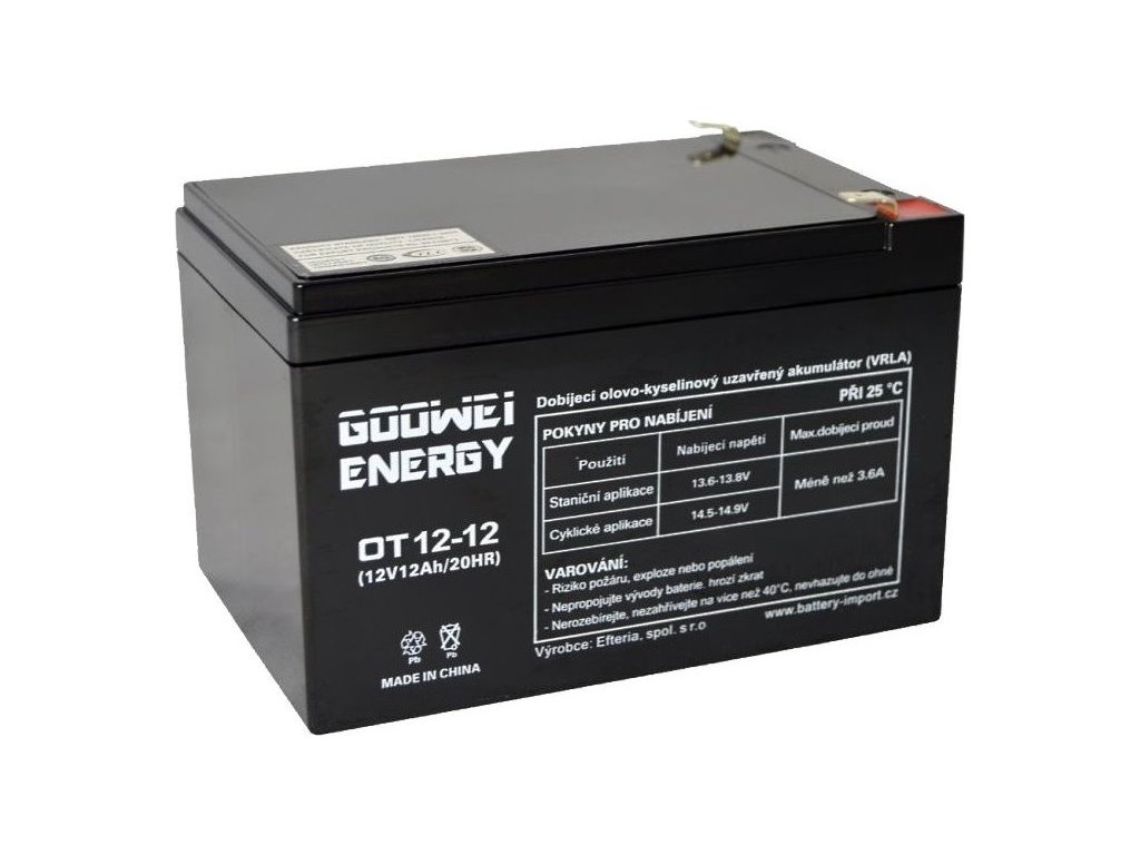 GOOWEI ENERGY OT12-12Záložní 12 V, 12 Ah olověný akumulátor v provedení VRLA (AGM) vhodný pro aplikace bez častého cyklování se spolehlivým záložním zdrojem.