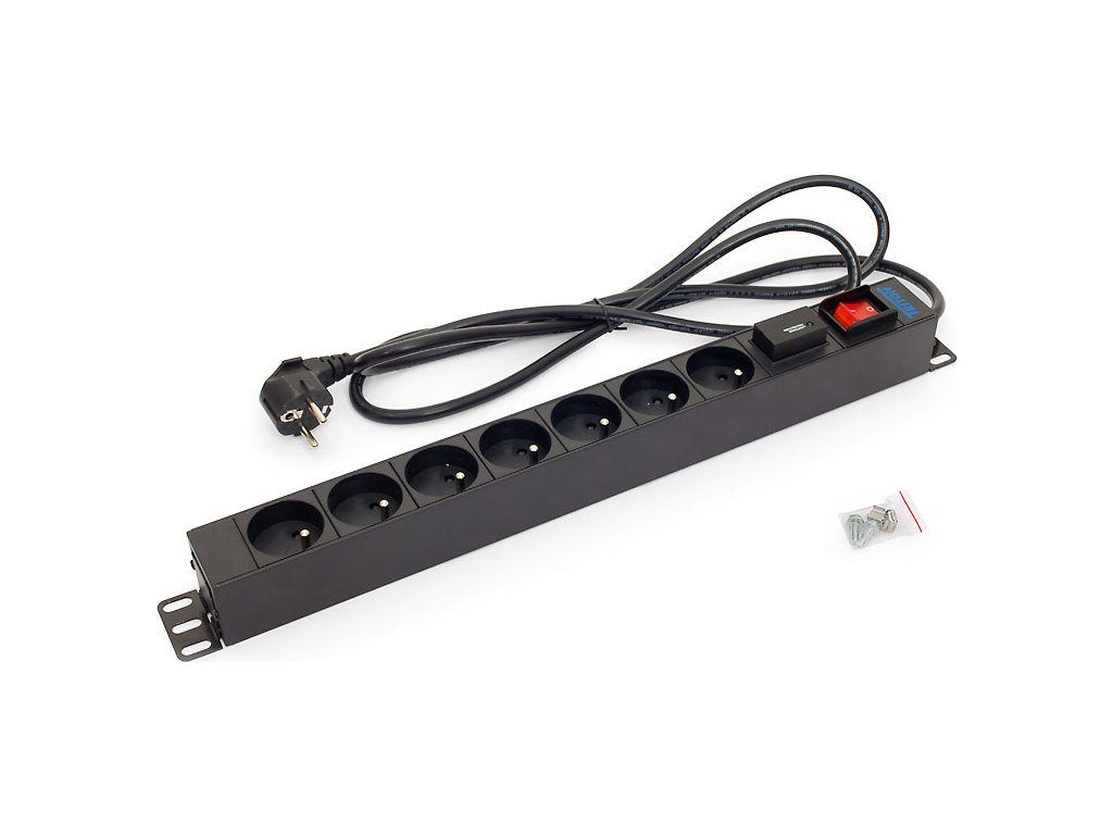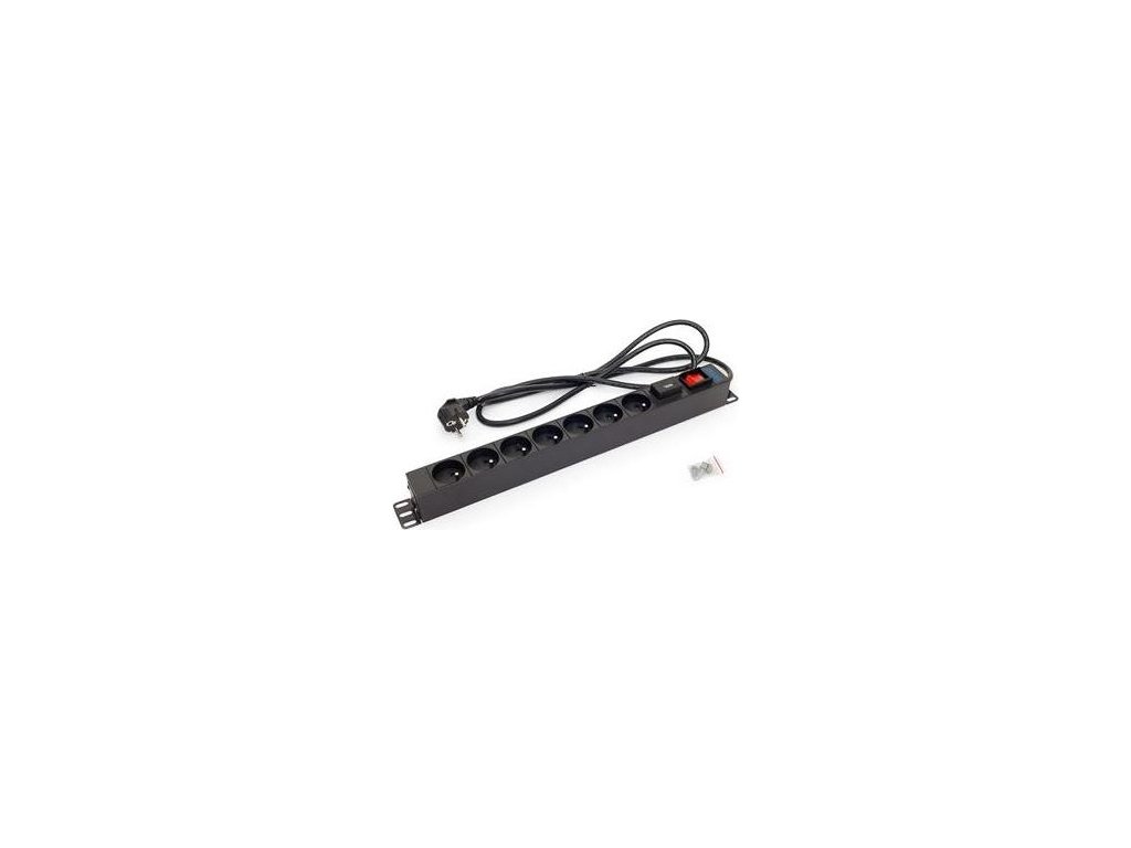 19“ rozvodný panel 1U; 7 x zásuvka podle ČSN, max. 16 A; kabel 3 x 1,5 mm, 2 m + zástrčka univerzál CZ-DE max. 16 A; bleskojistka; podsvícený vypínač; RAL 9005;