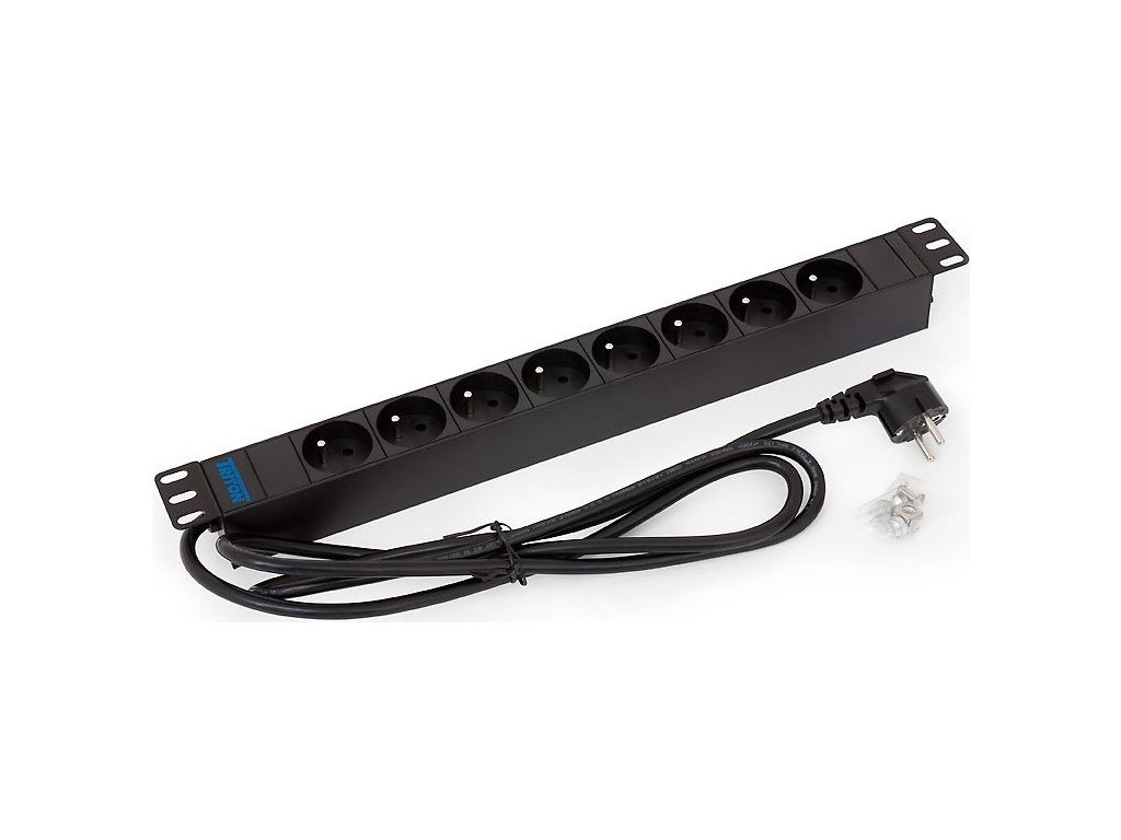 19" rozvodný panel 1U, 8x zásuvka podle ČSN, max 16A, kabel 3x1,5mm, 2m + zástrčka univezál CZ-DE max. 16A, RAL 9005