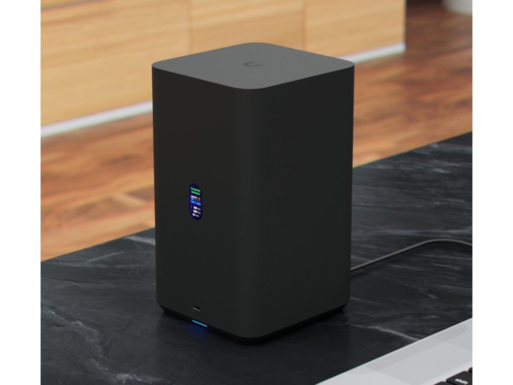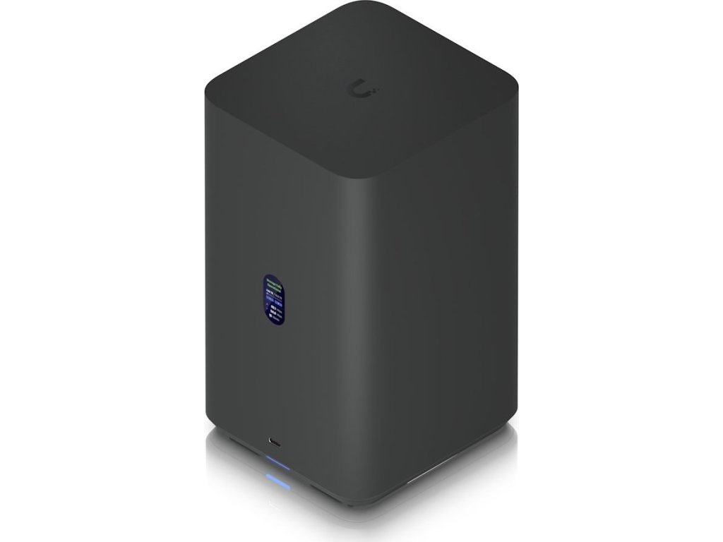 * Zařízení disponuje barevným 1.47" LCM displejem pro rychlé informace o stavu a podporuje správu přes UniFi Drive aplikaci.