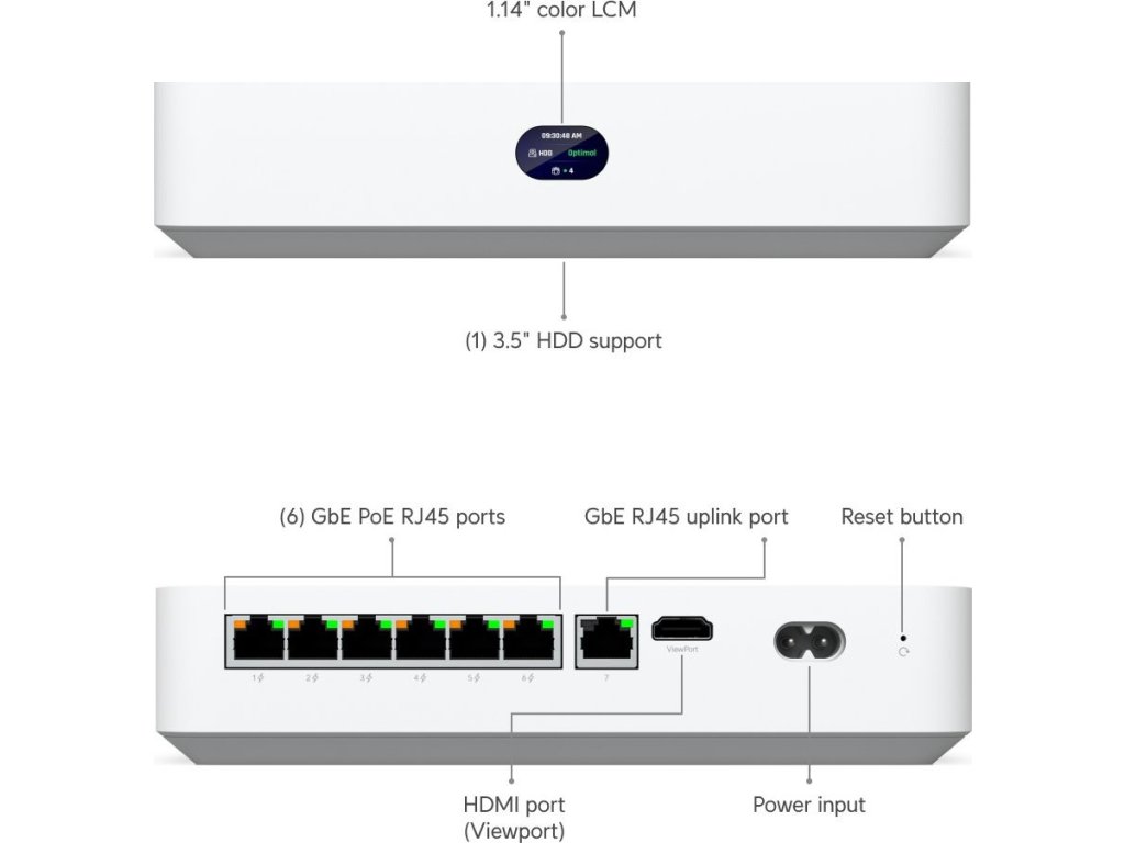 * UniFi Protect NVR s integrovaným 6portovým PoE přepínačem pro snadné připojení kamer.