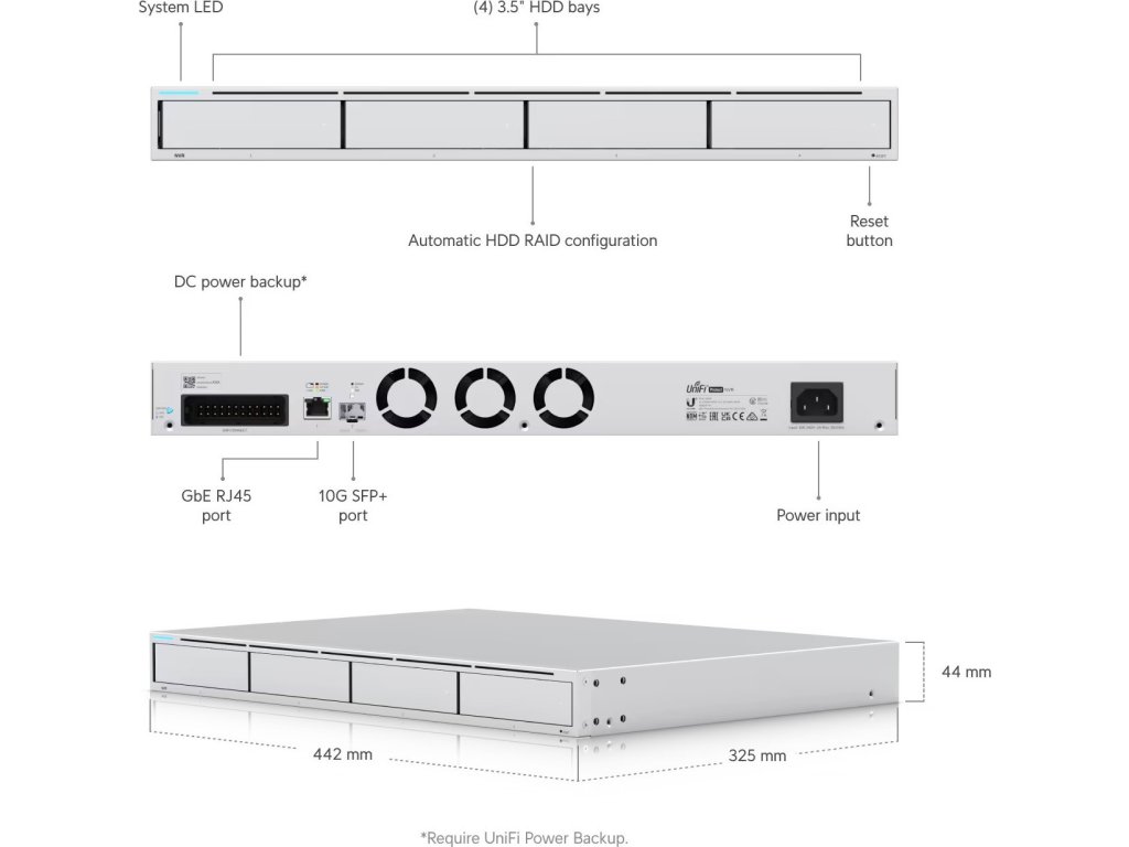 UniFi NVR je Enterprise zařízení, na kterém je předinstalovaný software UniFi Protect a je vybaveno 4 šachtami, do kterých lze umístit jak 2,5" tak 3,5" disky.