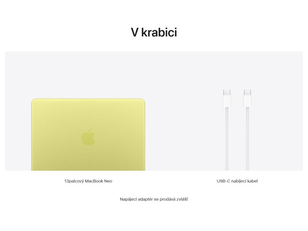 MacBook Neo, USB-C nabíjecí kabel (1,5 m). Napájecí adaptér se prodává zvlášť, minimální příkon pro nabíjení je 20 W.