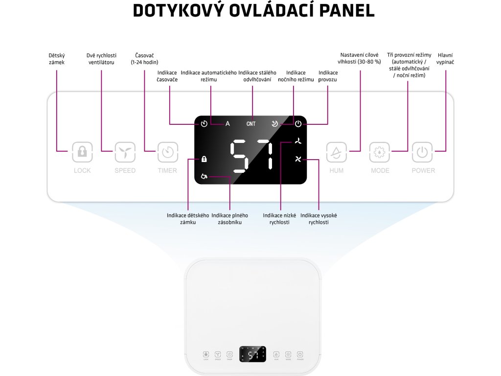 • Možnost nastavení cílové vlhkosti v rozsahu 30-80% v krocích po 5%