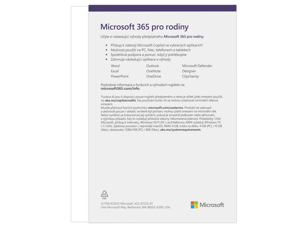 Pro jednu osobuMožnost používání až na pěti zařízeních současněMožnost používání na PC, Macu, iPhonu, iPadu a telefonech a tabletech s Androidem1 TB (1000 GB) zabezpečeného cloudového úložištěKancelářské aplikace s Microsoft CopilotemDesigner pro vytváření a editování obrázků s využitím umělé inteligenceVideoeditor Clipchamp s prémiovými filtry a efektyPokročilé zabezpečení v programu Microsoft Defender pro vaše osobní údaje a zařízeníAntiransomwarová ochrana souborů a fotografií na OneDrivuPrůběžná podpora a pomoc, kdykoli ji potřebujetePro používání Copilota a vytváření obrázků pomocí AI platí určitá omezení.