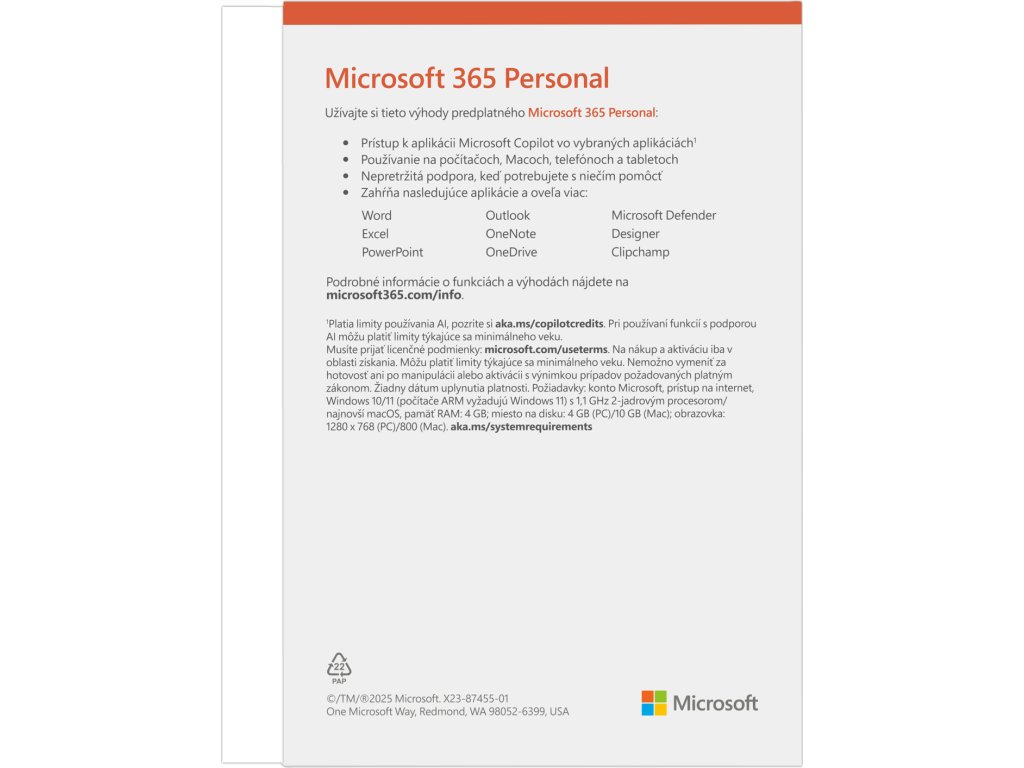 Pro jednu osobuMožnost používání až na pěti zařízeních současněMožnost používání na PC, Macu, iPhonu, iPadu a telefonech a tabletech s Androidem1 TB (1000 GB) zabezpečeného cloudového úložištěKancelářské aplikace s Microsoft CopilotemDesigner pro vytváření a editování obrázků s využitím umělé inteligenceVideoeditor Clipchamp s prémiovými filtry a efektyPokročilé zabezpečení v programu Microsoft Defender pro vaše osobní údaje a zařízeníAntiransomwarová ochrana souborů a fotografií na OneDrivuPrůběžná podpora a pomoc, kdykoli ji potřebujetePro používání Copilota a vytváření obrázků pomocí AI platí určitá omezení.