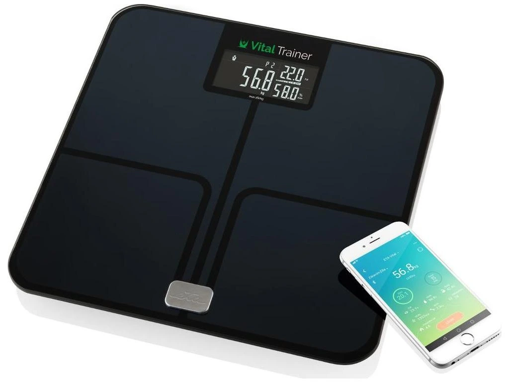 Analytická osobná váha so smart aplikáciou VITAL TRAINER, kapacita: do 180 kg / 396 lb / 28 st, rozlíšenie: 100 g, jednotky: kg / lb / st, v kombinácii so smart aplikáciou pomáha sledovať, pravidelne zaznamenávať a vyhodnocovať vývoj základných telesných charakteristík, možnosť stanovenia a sledovania cieľa užívateľa, zobrazuje, analyzuje a zhromažďuje namerané dáta - metabolický vek, viscerálny tuk, telesný tuk, vodu v tele, svalovinu, kosti, doporučuje minimálny kalorický príjem a vyhodnocuje index BMI, možnosť uloženia dát až 10-tich osôb, zobrazenie rozdielu medzi aktuálnou a poslednou zváženou hodnotou, funkcia pripomenutia športových aktivít, umožňuje sledovať pokroky jednotlivých nameraných hodnôt v čase, sklenená vážiaca plocha s ITO technológiou, indikátor preťaženia, indikátor slabej batérie, napájanie: 4 ks batérie AAA (sú súčasťou balenia), farba: čierna