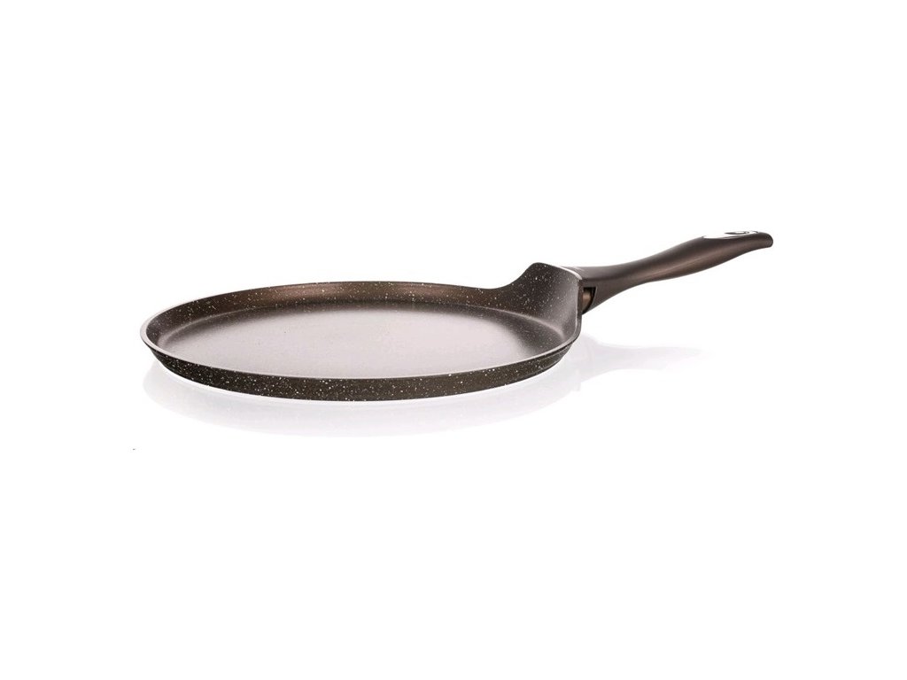 Pánev na palačinky s nepřilnavým povrchem PREMIUM Dark Brown 24 x 1,6 cmHliníková litá kovaná pánev na palačinky PREMIUM DARK BROWN s nepřilnavým povrchem, rozměr 24 x 1,6 cm, tmavě hnědý granitový dekor, tloušťka stěny 3 mm, plně indukční dno, soft-touch rukojeť. Nepřilnavý povrch je velmi tvrdý a odolný proti poškrábání. Pánev je odolná proti nárazu a deformaci tvaru.