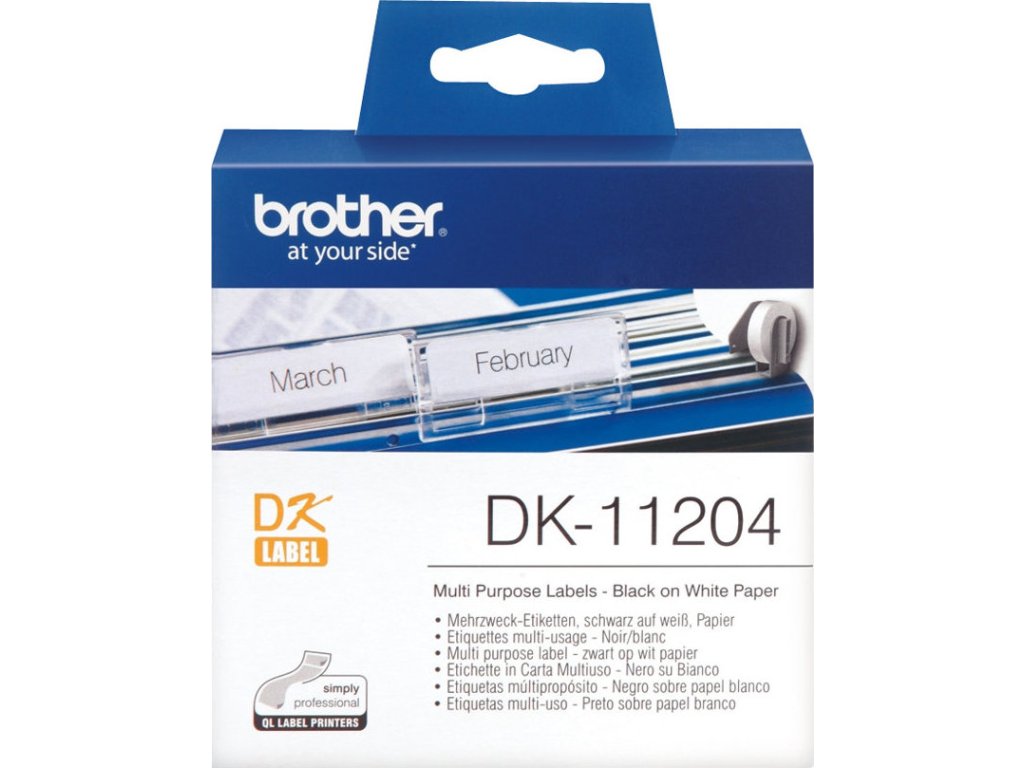 Tyto originální štítky Brother DK-11204 (černá na bílé) jsou užitečné pro širokou škálu vašich obecných požadavků na štítky. Pro použití v domácím i kancelářském prostředí mohou být tyto přednastavené standardní adresní štítky použity k tisku log, čárových kódů, vizitek návštěvníků nebo informací o přepravě.