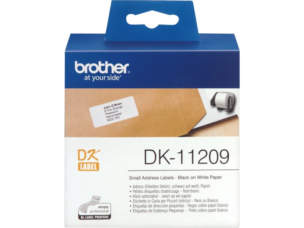 Originální štítky Brother DK-11209 s černým tiskem na bílém podkladu jsou vhodné pro širokou škálu obecných požadavků na značení. Pro využití v domácích i kancelářských prostředích mohou být tyto samostatné malé adresní štítky na roli použity k tisku log, čárových kódů, karet návštěvníků nebo informací o přepravě.
