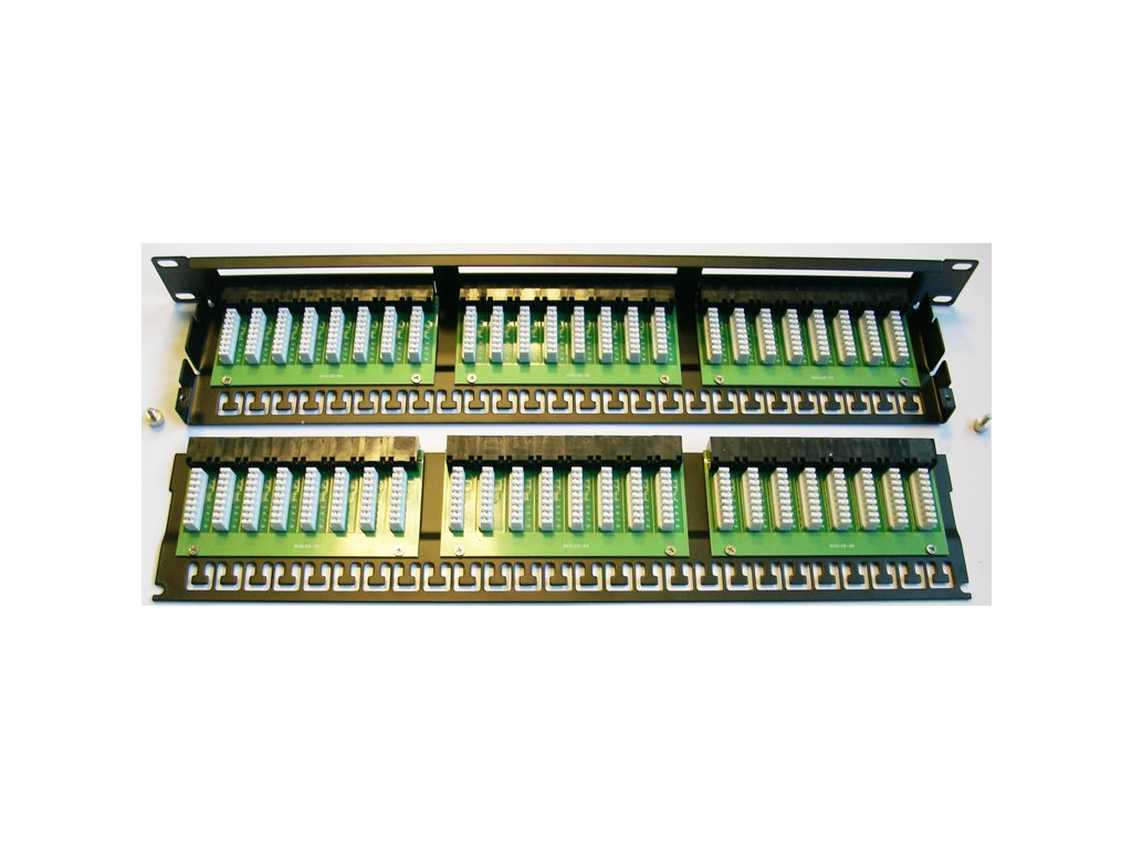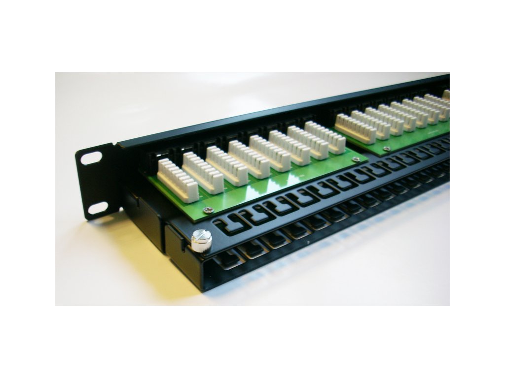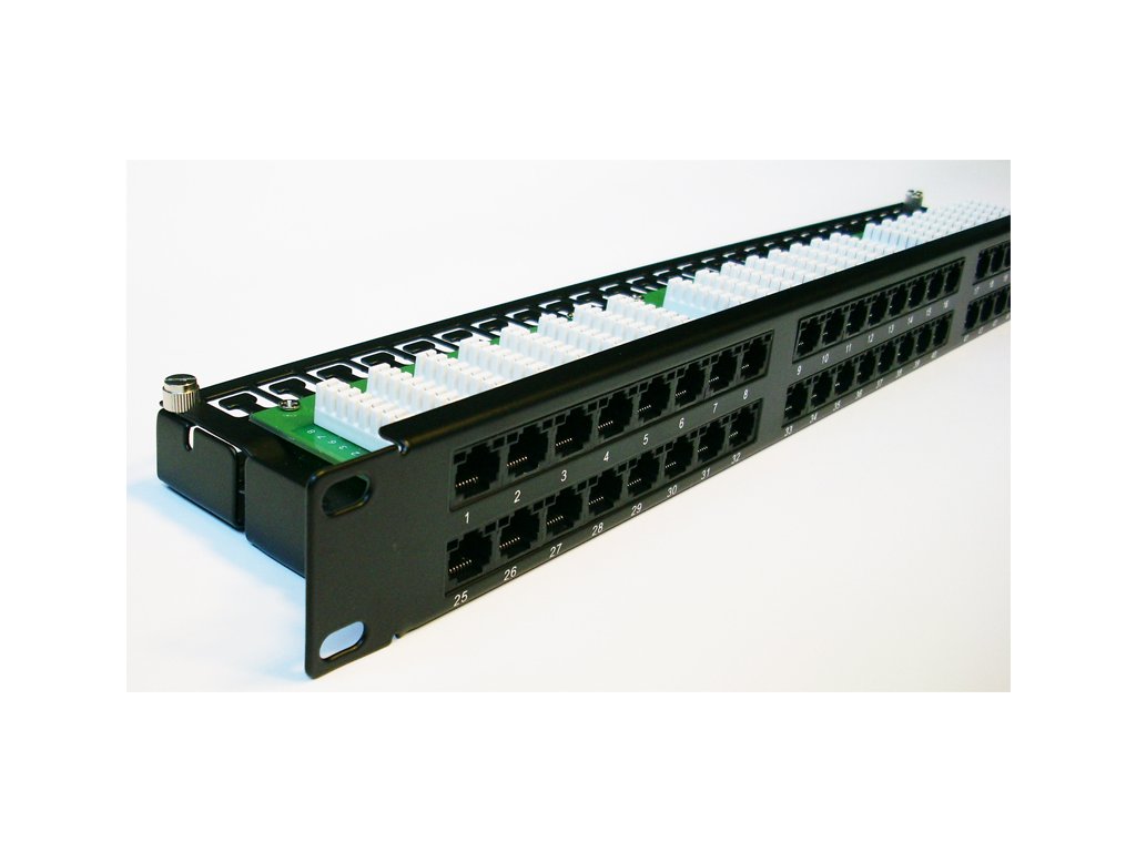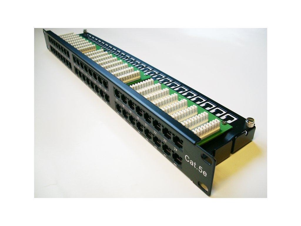 19" UTP Patch panel DATACOM 48 port- 19" Patch panel určený pro montáž do 19" datových rozvaděčů- 6 x 8 pozic zářezového pole LSA krone- výška 1U- cat. 5e- horní zářez- včetně vyvazovacího panelu- barva černá