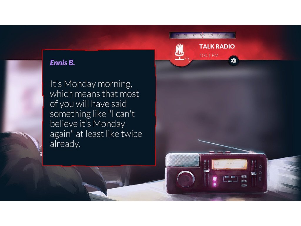Nový druh narativní hry, která maže hranice mezi fikcí a realitou a zkoumá naše vztahy s mainstreamovými médii prostřednictvím prizmatu rozhlasových stanic. Vestavěné funkce usnadnění zpřístupňují hru široké škále lidí - včetně nevidomýcha zrakově postižených hráčů. Hru oživuje rozmanité obsazení více než 20 úžasných umělců, včetně televizních, podcastových a YouTube osobností, takovými jako Jasika Nicole (Fringe, Welcome to Night Vale). Hra vznikla ve studiu, které stojíza kritiky oceňovanými hrami: A Normal Lost Phone a Another Lost Phone: Laura’sStory.