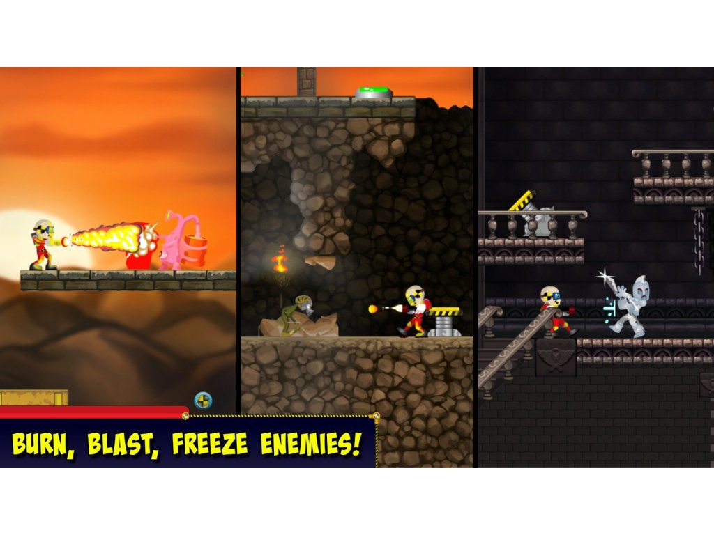 Fight your way through the unique worldscorrupted by D-TROIT using the power ofyour fists. If that doesn’t work, Burn,Blast and Freeze them.