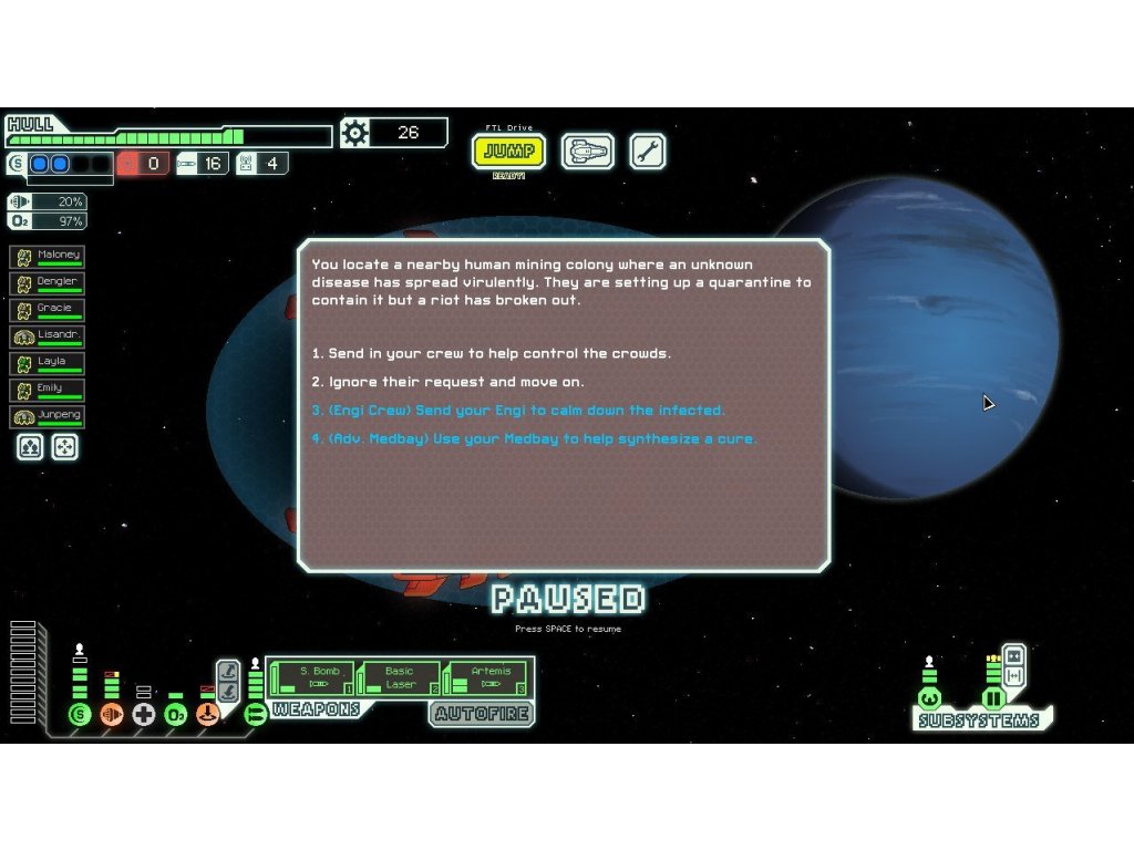 Ve FTL zažijete atmosféru řízení vesmírné lodi, která se snaží zachránit galaxii. Je to nebezpečná mise, přičemž každé setkání představuje jedinečnou výzvu s více řešeními. Co uděláte, když těžká raketová palba ničí vaše štíty? Přesměrujteveškerou energii do motorů ve snaze uniknout, napájejte další zbraně, abyste vyhodili svého nepřítele do vzduchu, nebo se s ním setkali v boji po nalodění.