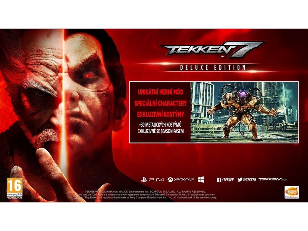Unreal Engine 4 - Tekken 7 poháněný Unreal Engine 4, je nejkrásnější hra Tekkensérie s téměř fotorealistickou grafikoua ohromujícími bojovými efekty.Zkušenostz nekončícího příběhu - úchvatné filmové sekvence, které vyprávějí příběh jsoukombinovány s horoucími souboji. Objevujrodinnou historii Mishima inovativním způsobem.Sada více než 30 hratelných postav - bohatá sbírka více než 30 postav obsahuje nové tváře a obrovský počet možných úderů, takže můžete zažít skutečnou svobodu při vedení vlastního bojového stylu. Najdi své oblíbené smrtící techniky,bojová umění, komba a vyhrávej zápasy!Hosté z Street Fighter: Akuma! -Akuma z Street Fighter byl přenesen do 3D a připojí se k boji se všemi svými charakteristickými pohyby ve stylu shoto a rovněž dodá ohnivé koule.Nové bojové mechaniky anové údery - klasické souboje 1vs1 se vracejí do hry! Nové údery a nová mechanika boje jako například „Rage Arts“, „Power Crushes“ a „Rage Drives“, které dělají hru ještě dostupnější pro hráče všechúrovní. Vítězné souboje s přáteli ve hřeTekken 7 můžou být založeny buď na tvrdém tréninku nebo na čisté zábavě.Závěrečná kapitola krvavé historie Mishima - Tekken 7 je poslední kapitola ve dvacetiletém rodinném sváru v klanu Mishima. Objevte netradiční konflikt mezi členy klanuMishima, kteří se snaží vyrovnat staréúčty a převzít kontrolu nad světovou říší.