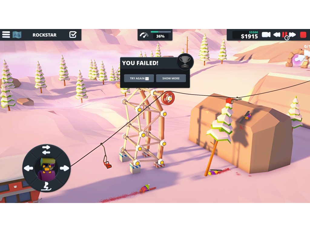 Vytvořte lyžařské vleky, skoky a mostyz nejrůznějších materiálů pro přepravu cestujících po každé úrovni. Staňte se mistrem fyziky lana, naučte se vše o výdrži a napětí, které budete řešit u všech druhů konstrukcí, které postavíte.