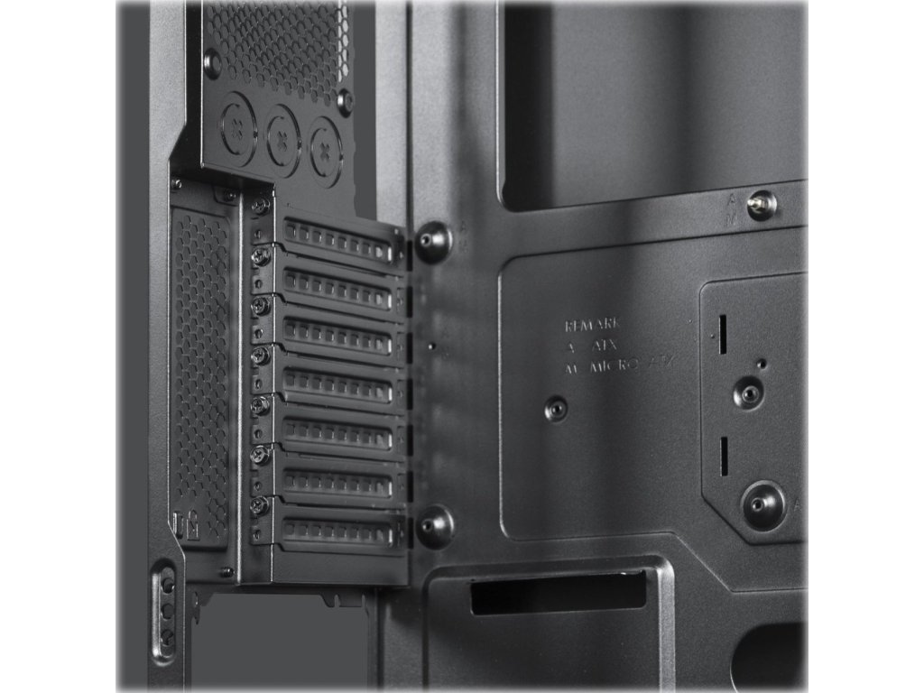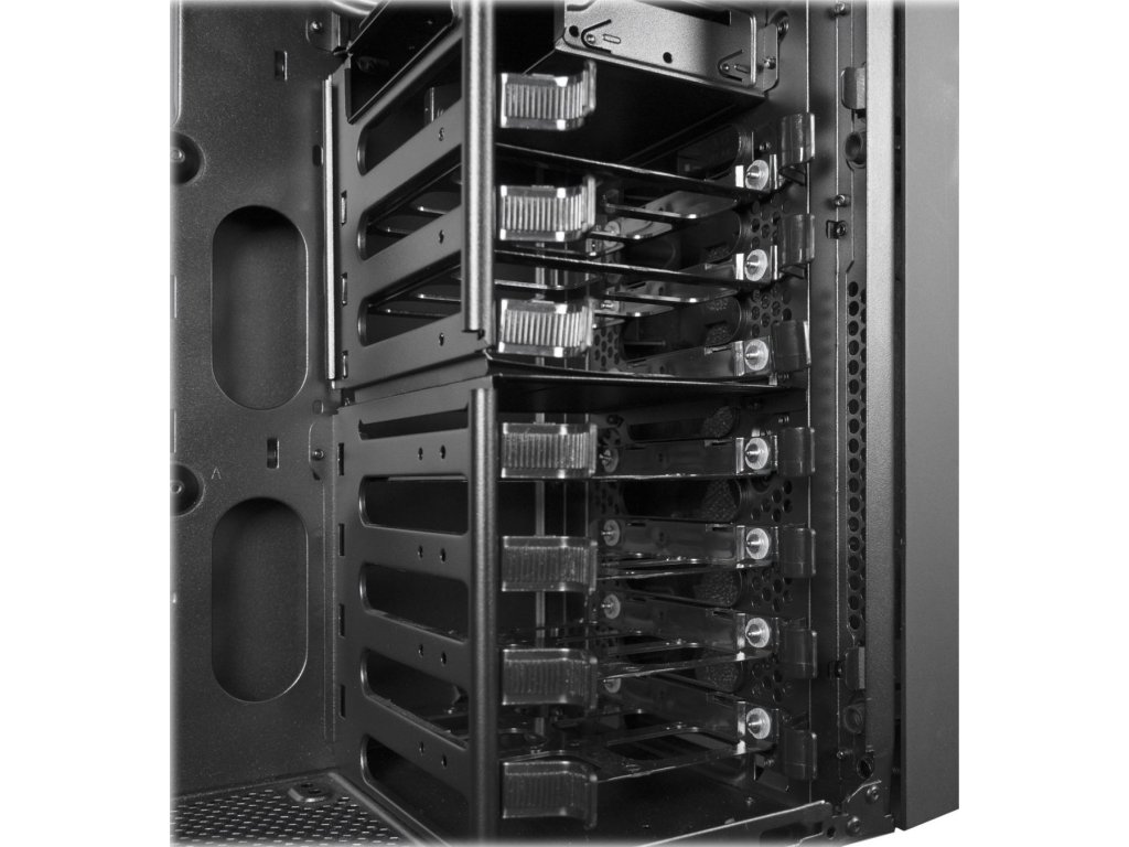 | Kompatibilita chladenia | Horná časť: 2x 120mm/140mm ventilátory alebo až 280mm radiátor (použitie 280mm radiátora blokuje prvý ODD disk) Predná časť: 2x 120mm ventilátory Zadná časť: 1x 120mm ventilátor Spodná časť: 1x 120mm alebo 140mm ventilátor (v závislosti od dĺžky PSU) |