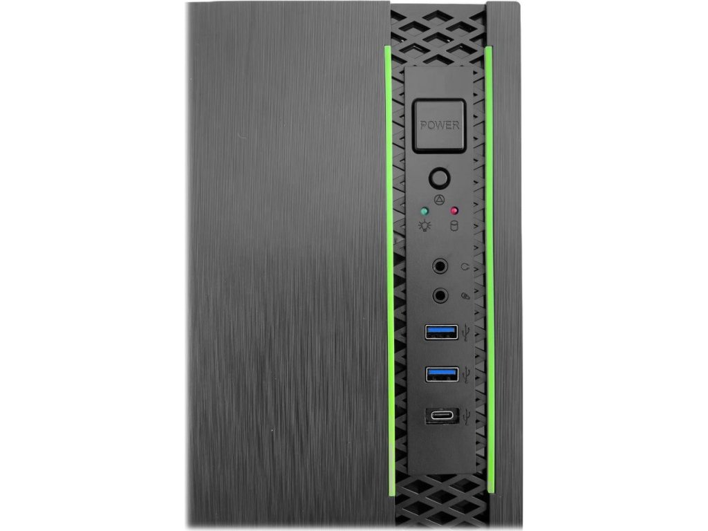 Konektory na předním panelu: 2× USB 3.0, 1× USB-C, 1× sluchátkový výstup, 1× vstup pro mikrofon