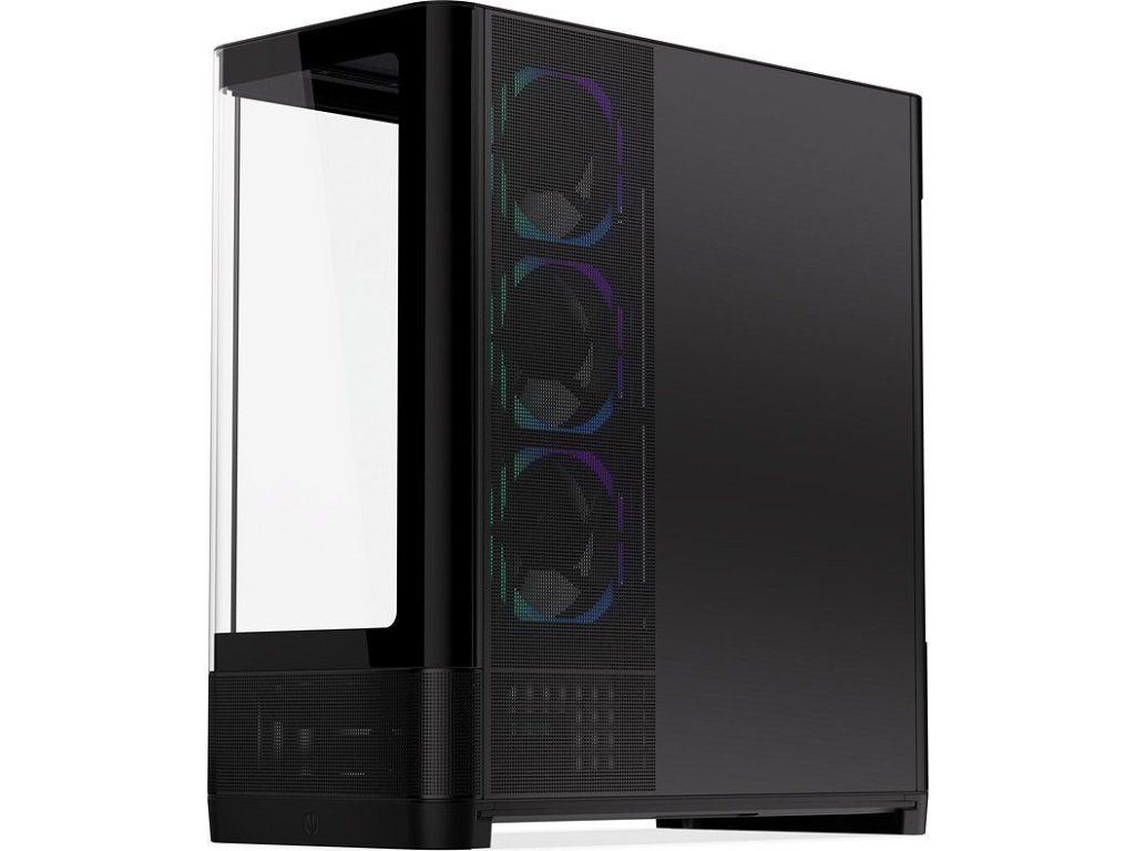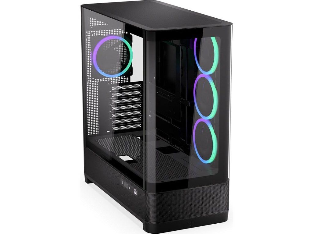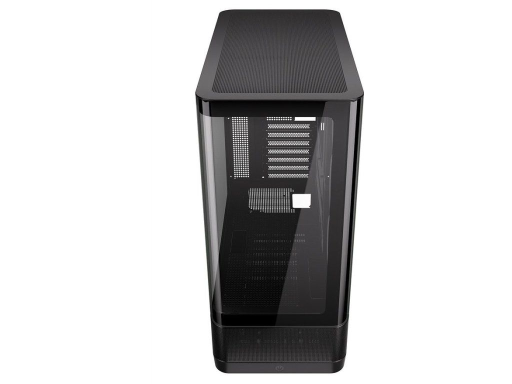 Panoramatická PC skříň typu showcase s elegantním zakřiveným skleněným panelem a optimalizovaným prouděním vzduchu.