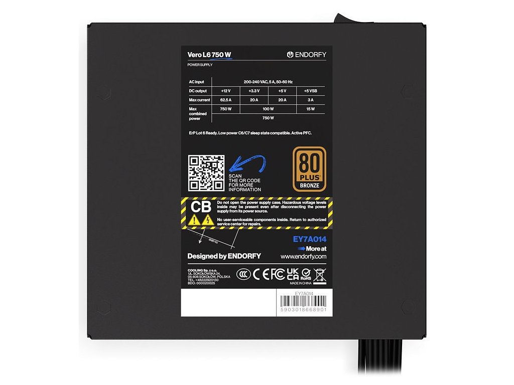 Napájecí zdroj Endorfy Vero L6 Bronze 750 W je navržen tak, aby spolehlivě a v tichosti utáhnul i výpočetně náročné PC sestavy. Díky certifikaci 80 PLUS Bronze a Cybenetics Silver dosahuje vysoké účinnosti, takže nebudete platit zbytečné účty za elektřinu. Současně podpoří stabilní napájení, ať už se jedná o herní, nebo pracovní počítač.