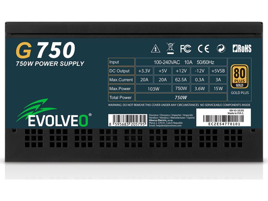 Se šířkou pouhých 158 mm se zdroj EVOLVEO G850-BK vejde i do menších PC skříní či stylových towerů. Přitom si zachovává sílu 850W, takže utáhne i grafiku aktuální generace – třeba NVIDIA® GeForce RTX™ řady 40 nebo 50. . Celkové dojmy z tohoto počítačového zdroje pak dotahuje k dokonalosti robustní konstrukce s plechy o tloušťce 0,7 mm nebo kvalitně zpracovaný hlavní síťový vypínač. Vzhledem k certifikacím LVD, EMC a RoHS zdroj odpovídá nejpřísnějším evropským normám. Ať už tak stojíte před jakýmkoliv úkolem, zaručeně vás podrží – jako spolehlivý parťák pro všechna dobrodružství ve světě jedniček a nul.