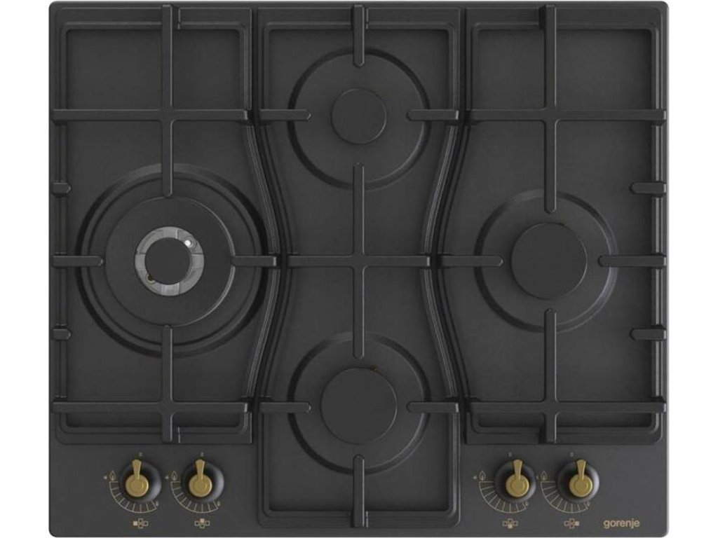 plynová varná doska, vstavaná, celkový príkon 8 150 W, 4 varné zóny, bezpečnostné sklo, mechanické/gombíkové ovládanie, poistka plynových horákov, elektrické zapaľovanie horákov, liatinové mriežky, rozmery dosky 60 × 13 × 52 cm, na pripojenie k plynu G20/20