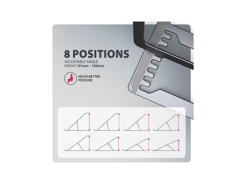 Velkou výhodou je možnost nastavení až osmi poloh. Díky tomu můžete notebook zvednout do výšky od 91 do 150 mm. Tím získáte další pracovní plochu ve správné úrovni očí, což výrazně zlepšuje ergonomii a pohodlí při práci, a zároveň zvyšuje vaši produktivitu.