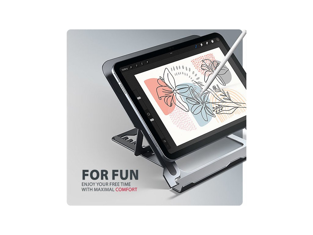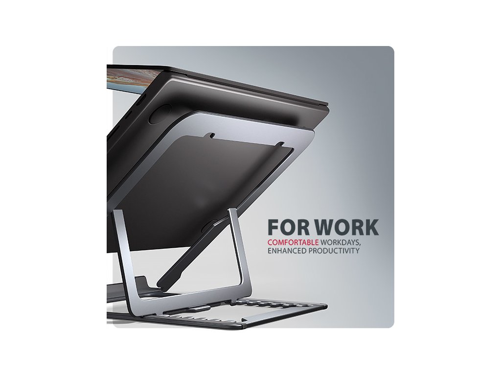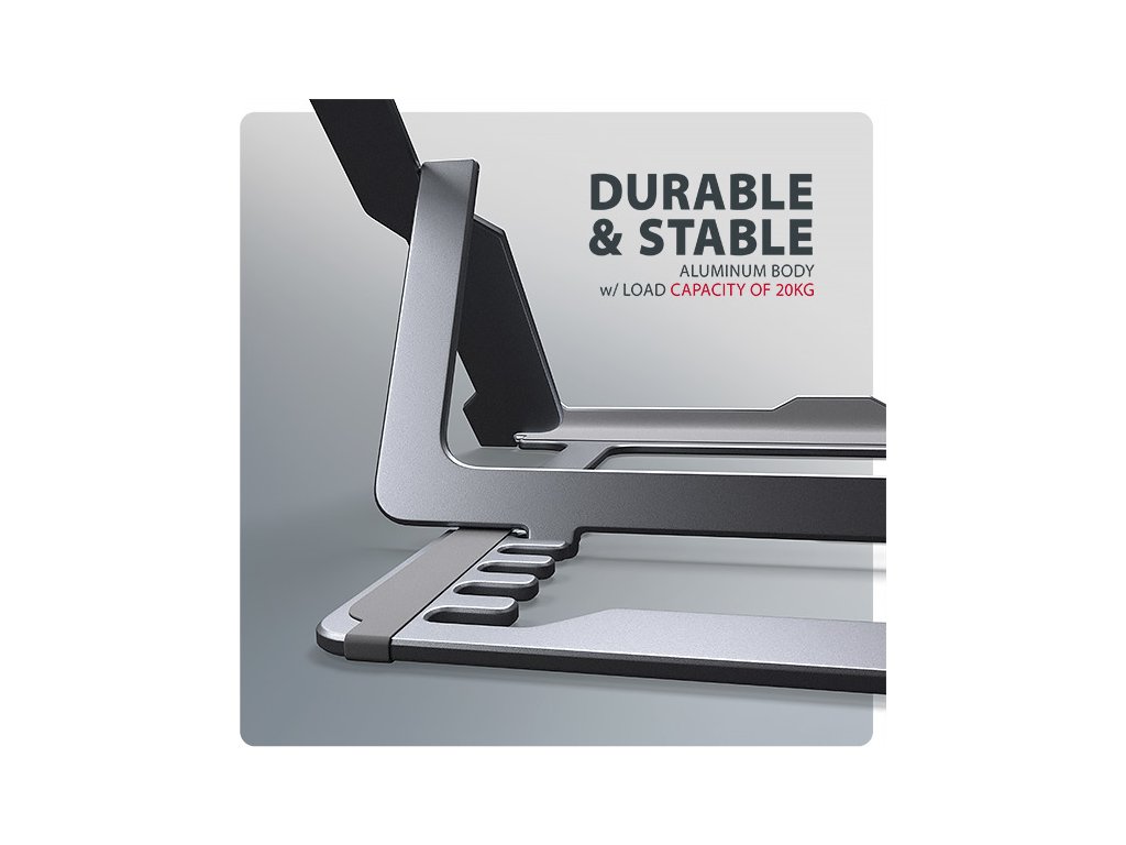 Podstavec je vyroben z hliníkových odlitků garantujících dlouhou životnost a spolehlivost. Díky protiskluzové úpravě se nemusíte obávat nežádoucích pohybů – vaše zařízení zůstane pevně na svém místě, a to bez poškození povrchu notebooku či podložky. Tyto pečlivě navržené vlastnosti zaručují perfektní stabilitu pro váš notebook, tablet nebo dokonce oblíbenou knihu, což vám poskytne klid a pohodlí při každodenním používání.