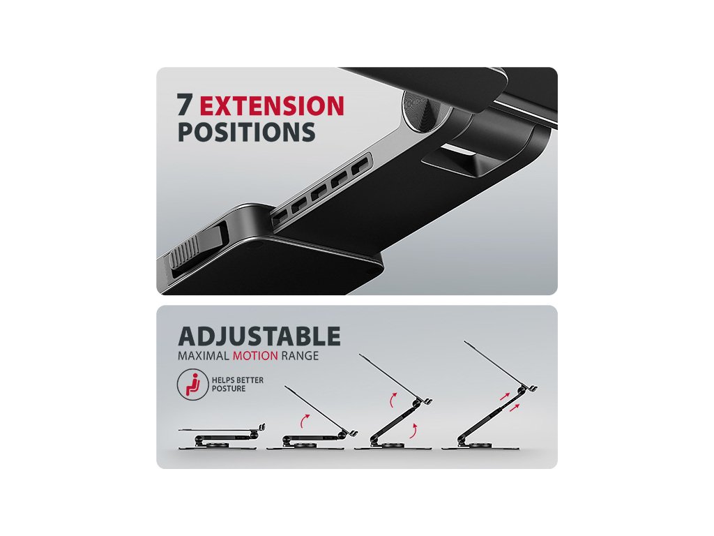 Unikátní funkcí je výsuvné rameno s pojistkou proti uvolnění, které umožňuje jeho prodloužení až o 6 cm díky sedmi nastavitelným pozicím. Tímto způsobem snadno nastavíte notebook do optimální výšky a vzdálenosti od vašich očí přesně podle vašich potřeb. Chytré řešení s dvojitým kloubem poskytuje plynulé nastavení výšky obrazovky tak, aby byla v jedné rovině s vaším externím monitorem. Tím získáte další pracovní plochu ve správné úrovni očí, což výrazně zlepšuje ergonomii, zvyšuje pohodlí a zároveň podporuje vaši produktivitu.