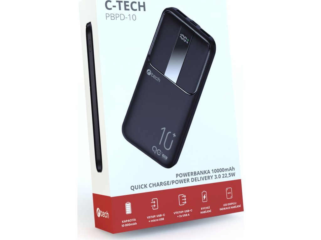 C-TECH Powerbanka 10000mAh, Li-Pol, 22,5W, USB-C/USB-A/micro USB