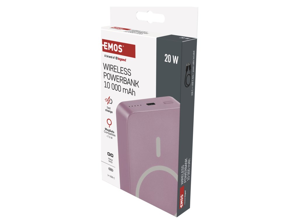 EMOS POWERBANKA WI1046, bezdrátové nabíjení 20W, 10.000mAh, LOSOSOVÁ, 1xUSB-C
